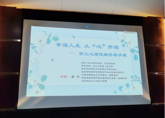 當(dāng)暮色漸染窗欞,一場(chǎng)關(guān)于心靈的滋養(yǎng)之旅悄然開啟。2025年10月28日下午17:30,公司工會(huì)特邀慈溪市錢海軍志愿服務(wù)中心國(guó)家二級(jí)心理咨詢師唐潔老師,為職工們帶來(lái)“幸福人生 從‘心’開始”心理健康專題講座,用實(shí)實(shí)在在的關(guān)懷為職工撐起“心靈保護(hù)傘”。